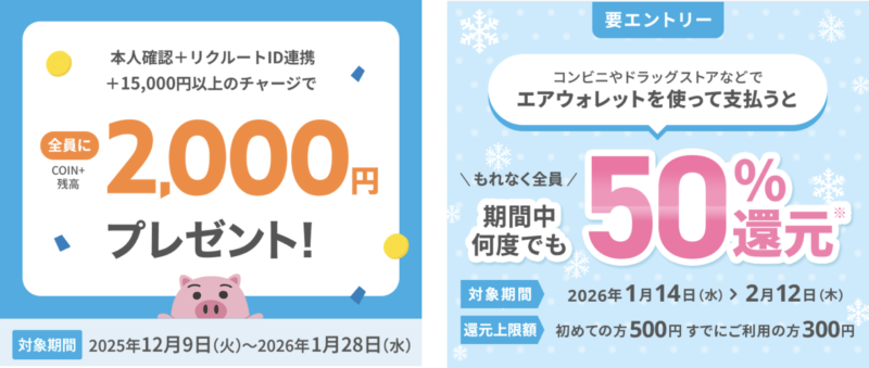 2026年1月14日(水)からエアウォレットの新規登録キャンペーンが開始しました!ユーザーは今回のキャンペーンでCOIN+での決済で50%還元!
