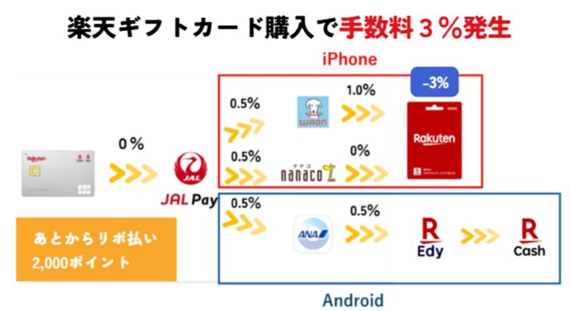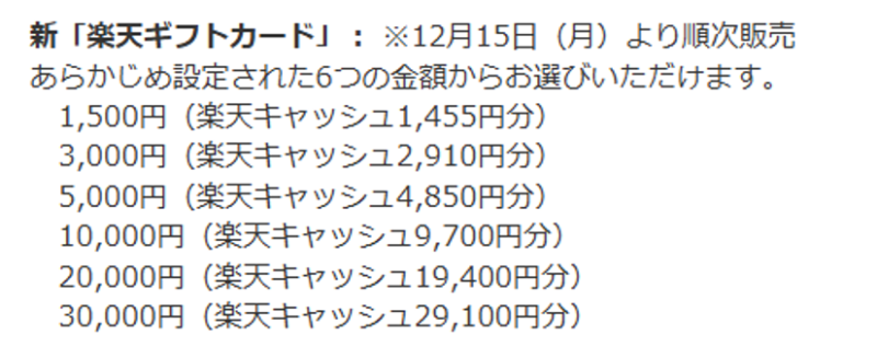 ただし、楽天ギフトカードを経由して楽天キャッシュへ交換するiPhoneユーザーは購入時に手数料3%が発生するためこれまでよりも還元率が低くなります…。