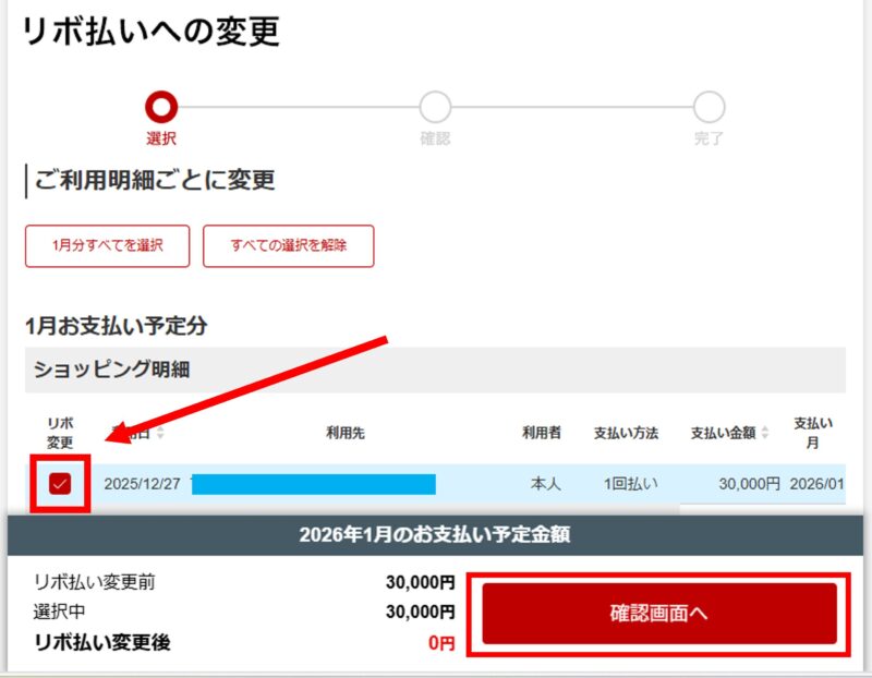 2.期間中にあとからリボ払いを必要金額分利用する(2026年1月8日(木)まで)