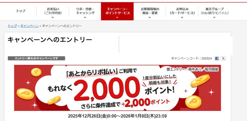 2025年12月26日(金)~2026年1月8日(木)の日程で楽天カード「あとからリボ払いキャンペーン」が開催中です。
