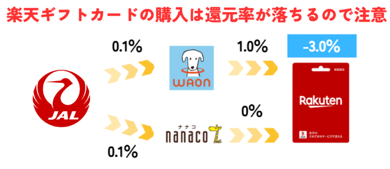 楽天カードからJALPayへのチャージはポイント付与対象外ですが、JALPayならWAON,nanaco,ANAPayへチャージすることで0.5%還元が受けられます。