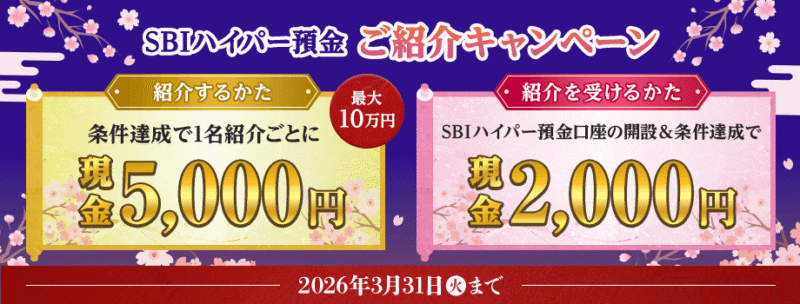 2026年2月16日(月)~3月31日(火)までの期間中に「SBIハイパー預金口座」を開設し、5万円以上の残高を保有していた方に最大2,000円が進呈されます。