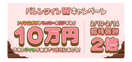 2月10日~2月14日に開催された「バレンタインWキャンペーン」ではトリマ公式Xをフォローして2月14日までにキャンペーン対象ポストをリポストすると抽選で1名に10万円相当のマイルが当たりました。