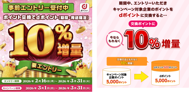 2026年3月から交換が開始されるdポイント増量キャンペーンではポイントを10%増量してdポイントへ交換することができます。
