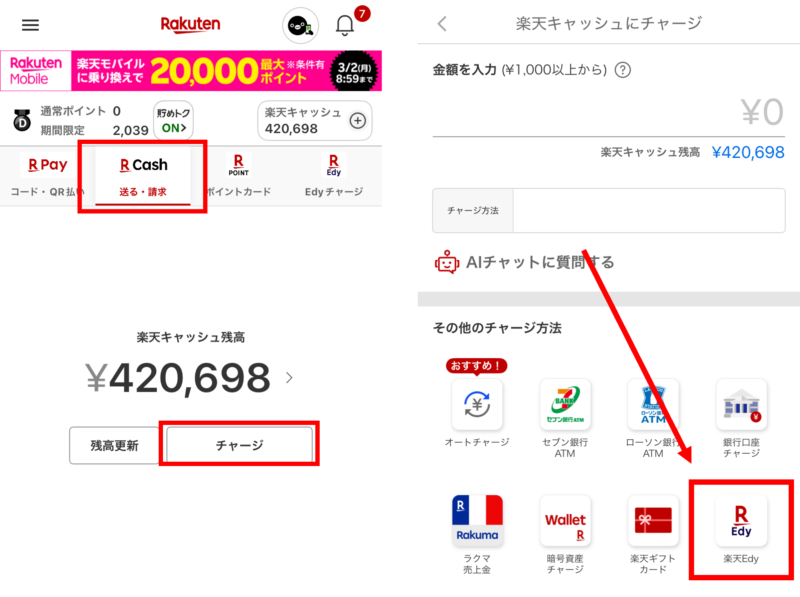 楽天Edyから楽天キャッシュへのチャージも楽天Payアプリから可能です。