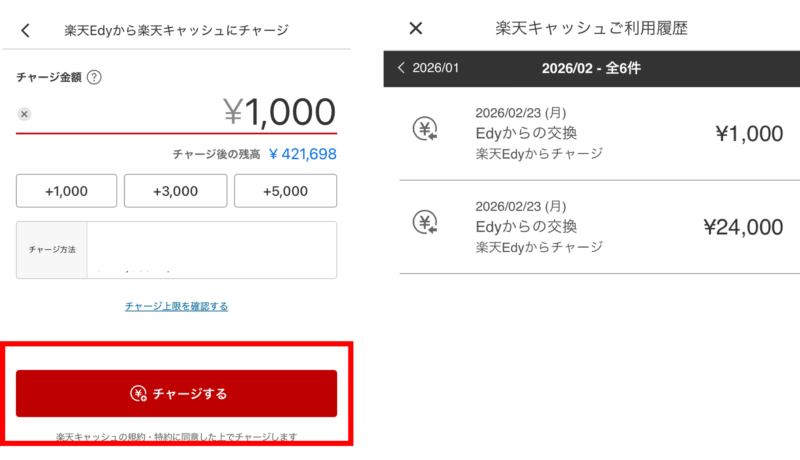「チャージする」をタップ。楽天キャッシュご利用履歴で確認しましょう