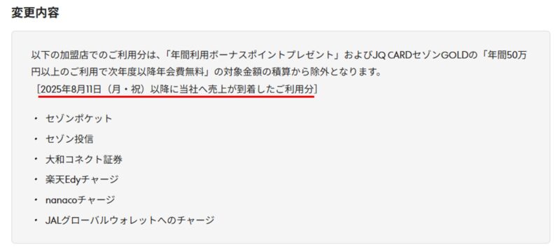 2025年8月より、JALPayへのチャージは年間利用ボーナスポイントの対象外となりました。インビテーションでJCBブランドを持ち、ファミペイバーチャルカードにチャージすることで回避することも可能でしたが、ファミペイへのチャージ上限金額が月最大40,000円までとなったことで達成が困難となりました。