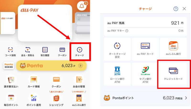 ANAPayトップ画面の「チャージ」からクレジットカードを選択します。auPayプリペイドのカード情報はトップ画面から確認可能です、ANAPayに登録を行います。
