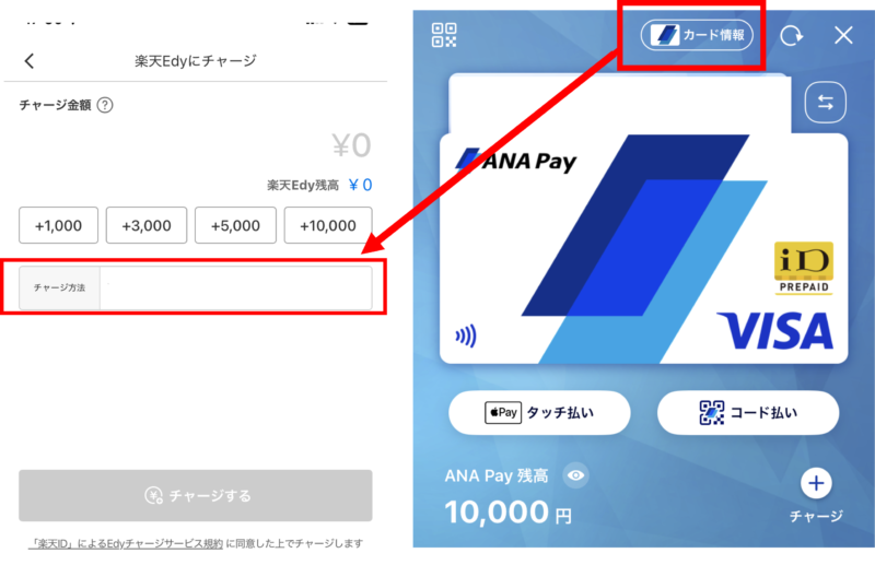 チャージ方法にANAPayのカード情報を入力することで楽天Edyへのチャージが完了します。