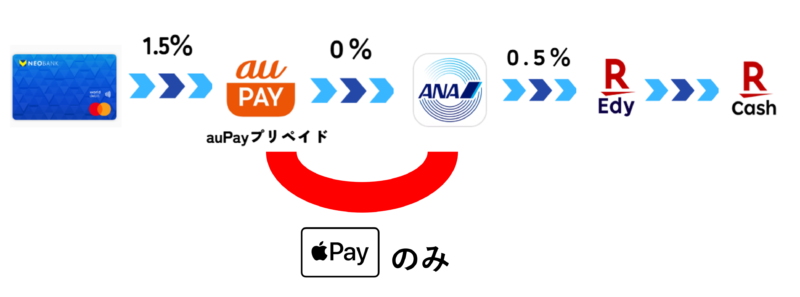 そこでVNEOBANKデビットからauPayプリペイド、ANAPayへのチャージルートを活用します。このルートならVポイントを貯めながら楽天キャッシュへ交換することが可能です。