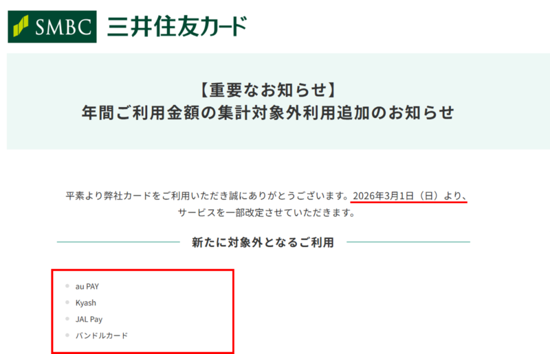 2026年3月1日から「JALPay」が三井住友カードの年間ご利用金額の集計対象外に追加されます。そのため、JALPayへのチャージで最大1.5%還元となるのは2026年2月までとなります。